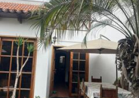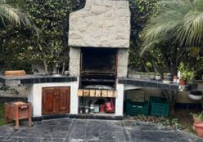 Sala con chimenea, comedor, sala de estar, escritorio, baño de visita, cocina con comedor de diario, terraza con BBQ y horno de barro, jardín, cocheras.